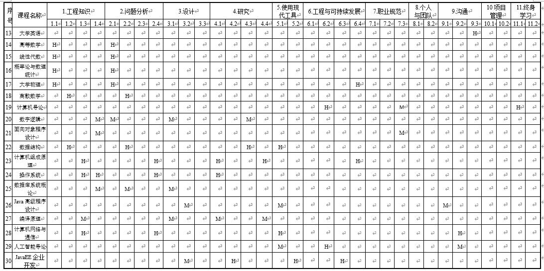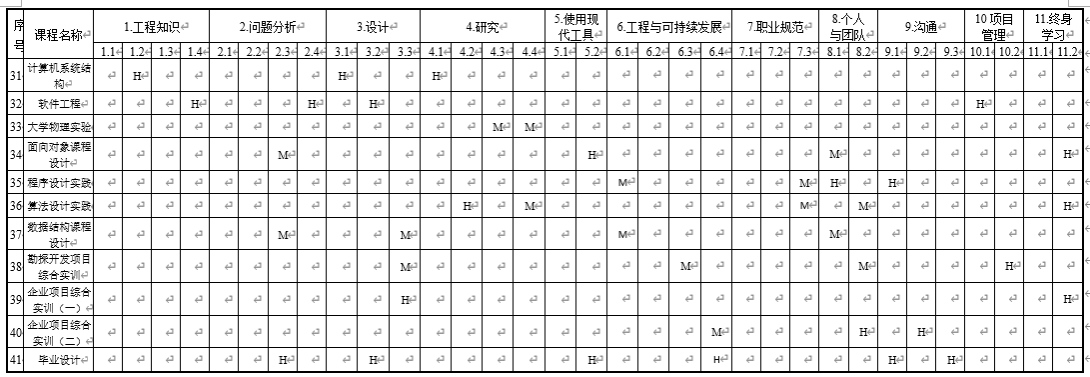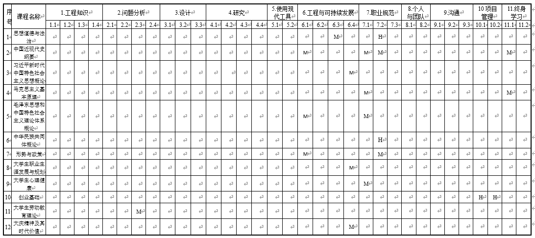 注:H代表教学环节对毕业 要求高支撑,M代表教学环节对毕业要求中支撑,L代表教学环节对毕业要求低支撑。